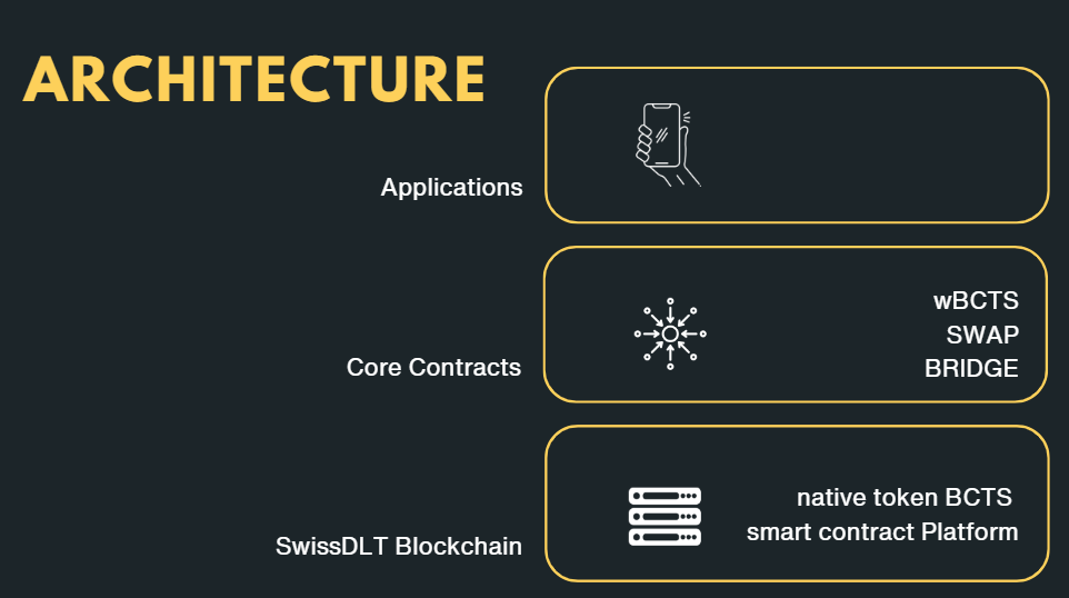 A set of smart contracts running on the SwissDLT blockchain help users to adopt the most common tools. This set up Smart Contracts will be updated regularly. Currently wrapped native Tokens wBCTS and an uniswap fork are live.